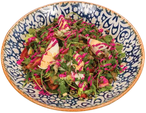 Cooked lentils and chickpeas, pickled red onions, cherry tomatoes, celery, rocket leaves, fresh herbs, olive oil, lemon juice and beet tahini.
